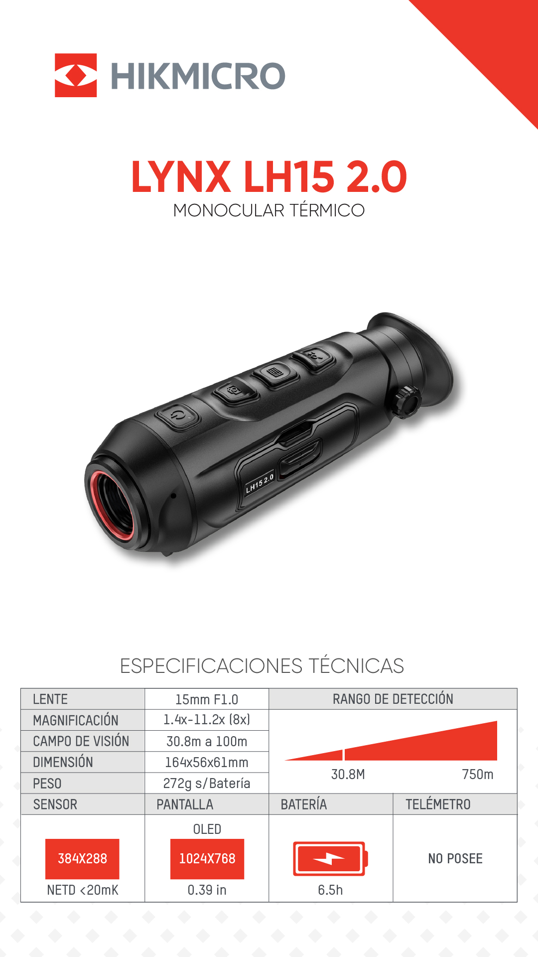 El monocular térmico HIKMICRO LYNX Pro LH15 está equipado con un detector infrarrojo de 384×288 y una pantalla LCOS de 1280×960. Admite funciones de observación, punto de acceso Wi-Fi, etc. El detector térmico integrado de alta sensibilidad proporciona una visión nítida incluso en la oscuridad total. El monocular se utiliza principalmente en escenarios como búsqueda y rescate, senderismo, viajes y caza.
