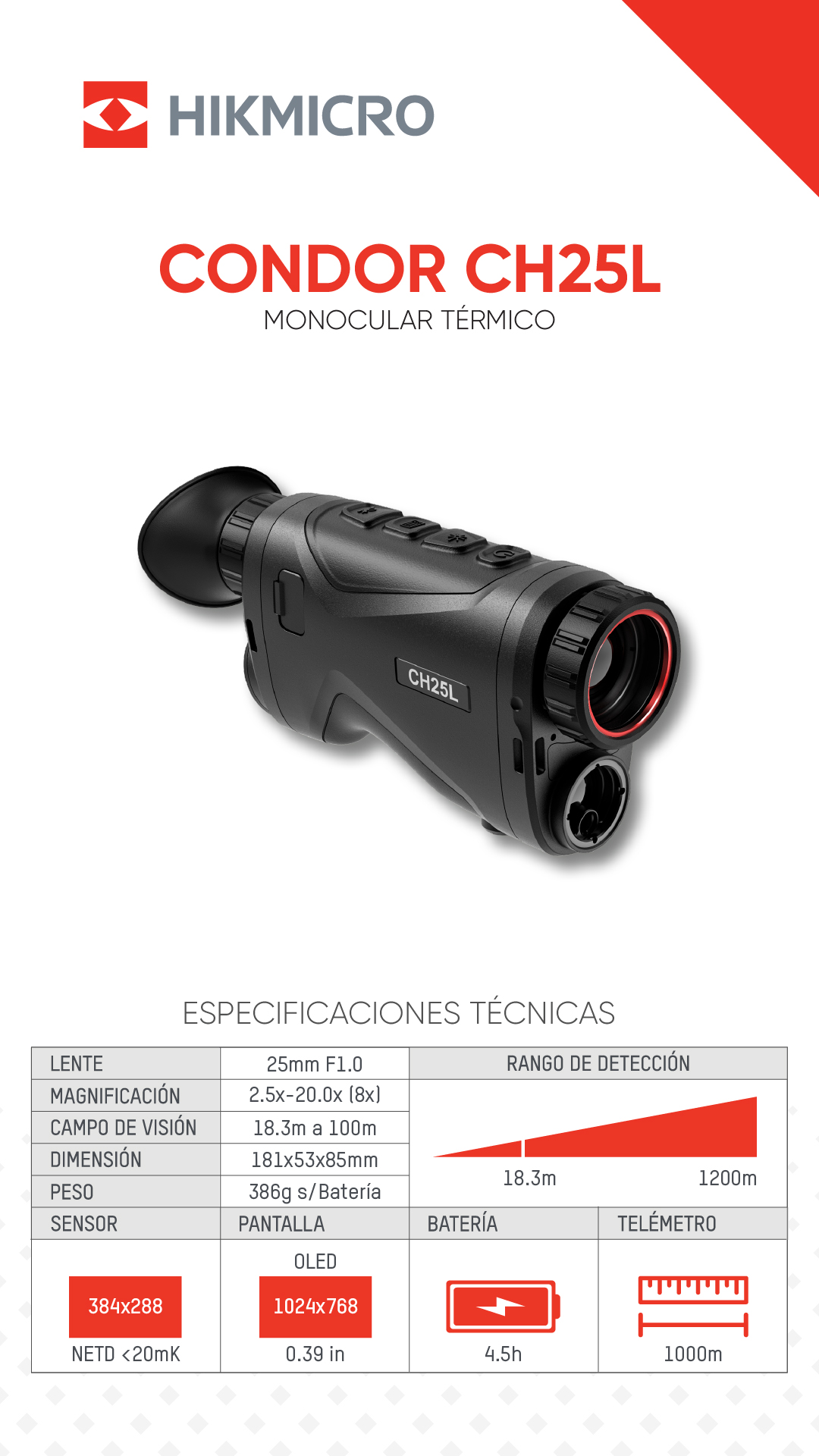 El monocular térmico HIKMICRO CONDOR CH35L está equipado con un detector infrarrojo de 384×288 a 12 µm y una pantalla OLED de 1024×768. Con una densidad óptica neta (NETD) inferior a 20 mK, lo que representa una alta sensibilidad térmica, garantiza una calidad de imagen perfecta y un reconocimiento de detalles incluso en las condiciones climáticas más adversas. Su telémetro láser de 1000 m permite medir con precisión la distancia al acecho u observación en condiciones de poca luz. Se puede utilizar principalmente en caza forestal, observación de aves, búsqueda de fauna, aventuras y refugios.