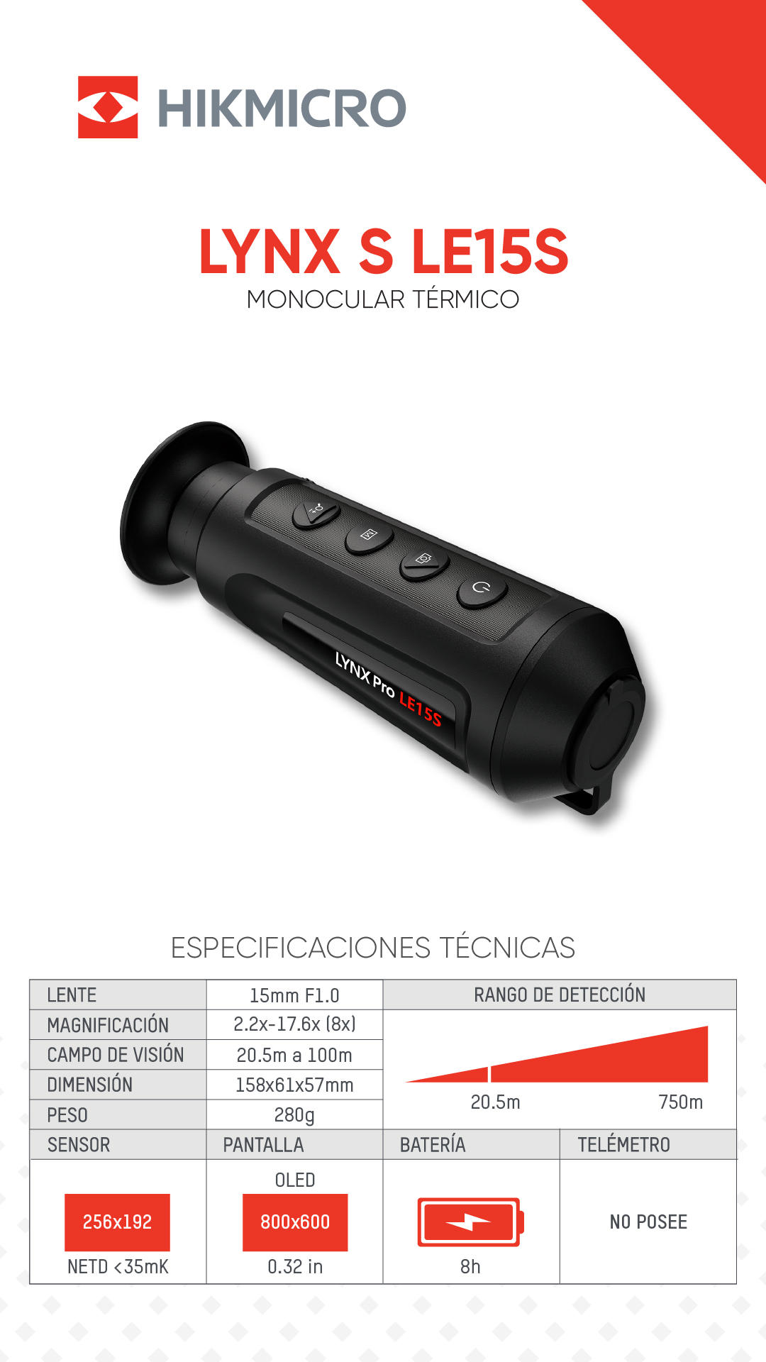El monocular térmico HIKMICRO LYNX S LE10S está equipado con un detector infrarrojo de 256×192 y una pantalla OLED de 800×600. Admite funciones de observación, medición de distancia, punto de acceso, etc. El detector térmico integrado de alta sensibilidad proporciona una visión nítida incluso en la oscuridad total. El monocular se utiliza principalmente en escenarios como caza, senderismo, búsqueda y rescate, etc.